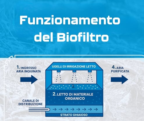 Un impianto di biofiltrazione dell’aria convoglia il flusso inquinato all’interno di un letto filtrante biologico, dove microrganismi naturali degradano i composti nocivi trasformandoli in sostanze innocue (acqua, CO₂ e biomassa).